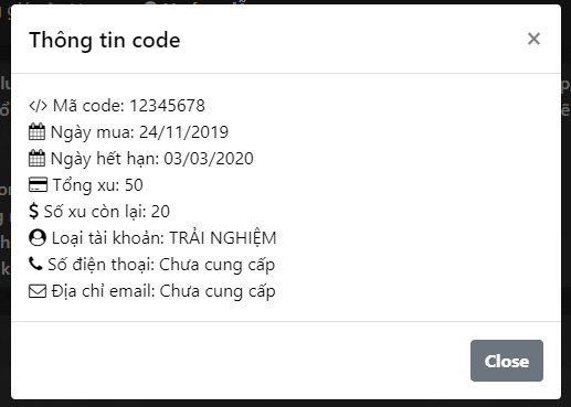 Việc kiểm tra CODEVIP thường xuyên giúp bạn kiểm soát thời hạn, tránh để CODEVIP hết hạn, gây lãng phí xu. Để kiểm tra CODEVIP, bạn tiến hành đăng nhập . Sau khi đăng nhập, bạn nhấn vào biểu tượng , chọn . 1 thông báo hiện ra, hiển thị thông tin có liên quan đến CODEVIP của bạn: